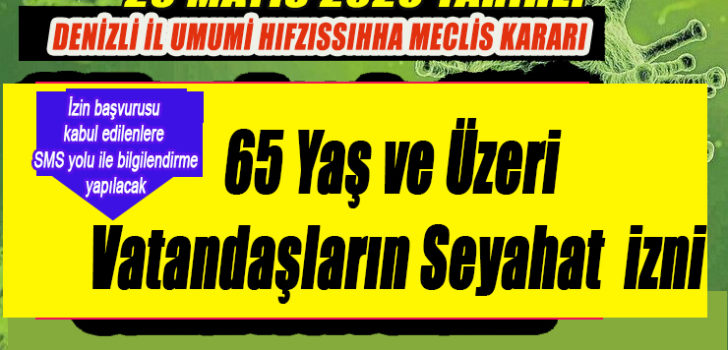 Denizli İl Umumi Hıfzıssıhha Meclisi 1593 sayılı Umumi Hıfzıssıhha Kanunu’nun 23. maddesine göre, Vali Hasan KARAHAN’ın başkanlığında COVİD-19 tedbirleri hususunda olağanüstü olarak İçişleri Bakanlığının 20.05.2020 tarihli 65 Yaş ve Üzeri Vatandaşların Seyahat İzni konulu yazısına istinaden aşağıda belirtilen tedbirlerin alınmasına yönelik toplanmıştır. Bu kapsamda;