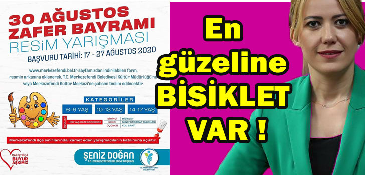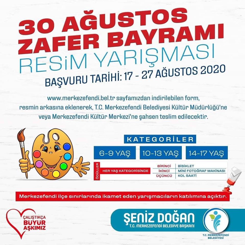 Merkezefendi Belediye Başkanı Şeniz Doğan, “Merkezefendi Belediyesi olarak 30 Ağustos Zafer Bayramımıza özel olarak resim yarışması düzenliyoruz. İlçemizde daha çok sosyal ve kültürel faaliyetleri etkinlikler gerçekleştirerek, ilçemizi sanatın ve kültürün merkezi haline getireceğiz. 6 ile 17 yaş arasındaki Merkezefendili çocuklarımızı, gençlerimizi resim yarışmamıza katılmaya davet ediyorum” dedi. . Başvuru http://merkezefendi.bel.tr/formlar/resim-yarismasi.pdf