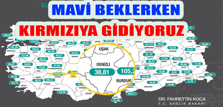 Sağlık Bakanı Fahrettin Koca, sosyal medya üzerinden 27 Şubat-5 Mart haftası içinde illere göre 100 bin nüfusa düşen, korona vaka sayısının güncel haritasını paylaştı. Geçtiğimiz hafta 32.14 olarak açıklnan Denizli’de bu sayıya göre Sarı Renkli ( Orta Riskli ) bölümde yer almıştı.