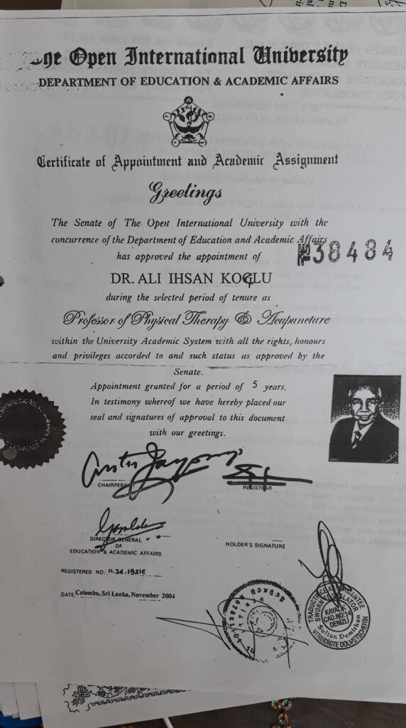 Bir dönem hastalarına şifa dağıtan İlimizin sevilen simalarından Prf. Dr. Ali Koçlu, The Open İnternational University (Uluslararası Açım Öğretim Üniversitesi) Tamamlayıcı Tıp Fakültesi tarafından 143 Ülkede Öğretim Üyesi olarak görev yapabileceği belgeyle yetkilendirildi.