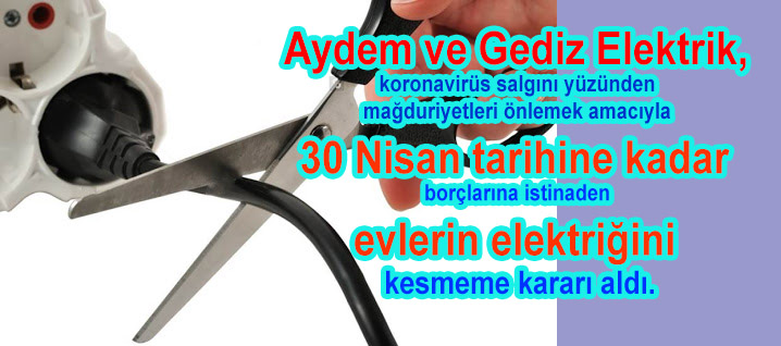 Aydem ve Gediz Elektrik, koronavirüs salgını yüzünden mağduriyetleri önlemek amacıyla 30 Nisan tarihine kadar borçlarına istinaden evlerin elektriğini kesmeme kararı aldı.