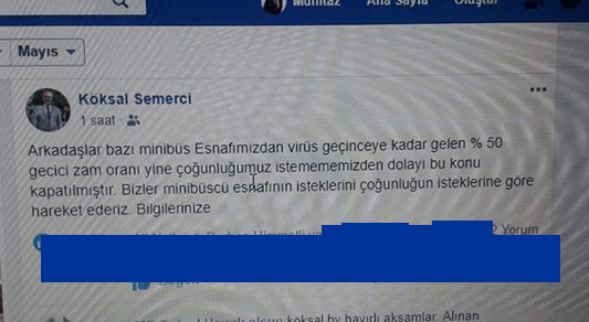 “Arkadaşlar bazı minibüs Esnafımızdan virüs geçinceye kadar gelen % 50 gecici zam oranı yine çoğunluğumuz istemememizden dolayı bu konu kapatılmıştır. Bizler minibüscü esnafının isteklerini çoğunluğun isteklerine göre hareket ederiz.” Bilgilerinize.. Diyerek, ZAM OLMAYACAĞINI sosyal medya hesabından ilan ederek vatandaşlardan yüzlerce olumlu yorum aldığı görüldü. Haber ; Bakış gazetesi Mümtaz Dündar