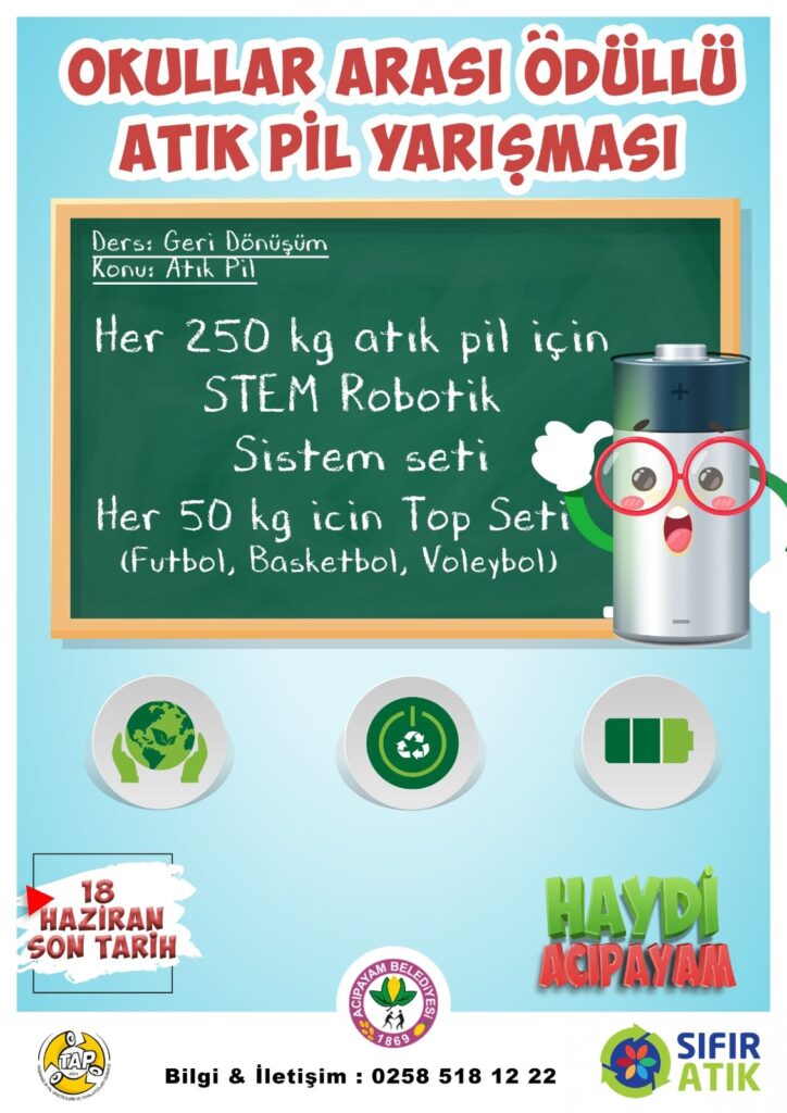 Okullar arası yapılacak yarışmada, her 250 Kg. atık pil için STEM Robotik Sistem Seti, her 50 Kg. atık pıl toplayanlara ise Top Seti verileceği ( Futbol – Basketbol- Valeybol ) Yarışma bitiş tarihi 18 Haziran 2021 olarak duyuruldu.
