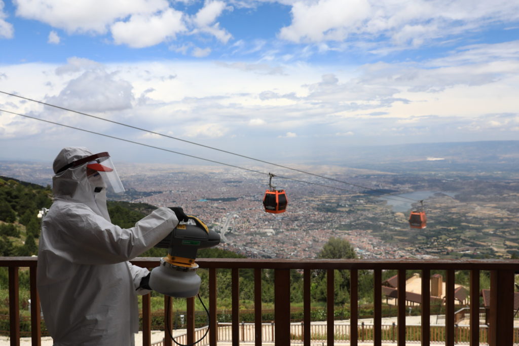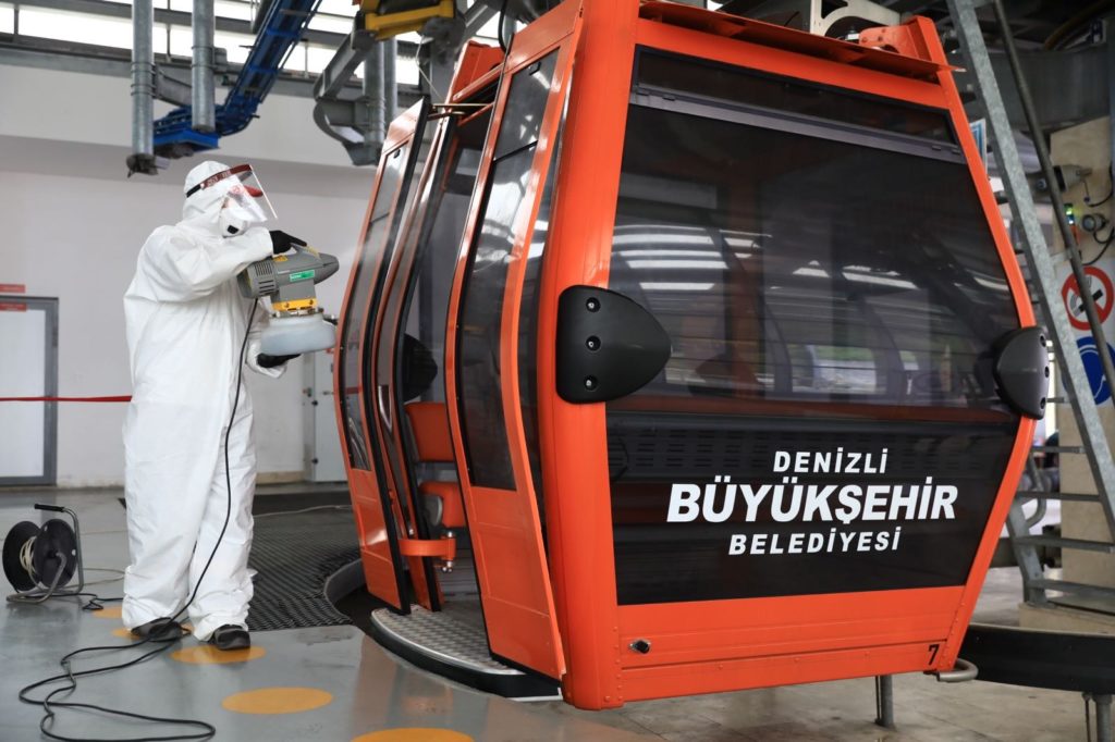 Yeni normal döneme geçişle beraber geçici süre kapatılan tüm tesislerinde Kovid-19’a karşı tedbir alan Denizli Büyükşehir Belediyesi ekipleri, Denizli Teleferik ve Bağbaşı Yaylası’nda dezenfekte çalışması yaparak tesisi ziyarete hazır hale getirdi.