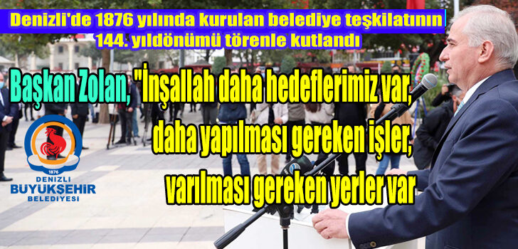 Denizli’nin artık parmakla gösterilen bir şehir haline geldiğini kaydeden Başkan Zolan, “Denizlimiz örnek bir şehir haline gelmiştir. Altyapısı, üstyapısı, yeşil ve spor alanları, trafik düzeni, köprülü kavşakları, temiz havası, hangi yönünden bakarsanız bakın Denizlimiz daha güzele doğru gitmiştir” dedi. Şehrin menfaatleri söz konusu olduğunda birlik ve beraberlik ruhunun Denizli’de hakim olduğuna dikkati çeken Başkan Zolan, Büyükşehir Belediyesi olarak yeni hedeflere yürüdüklerini ve artık dünya kentleri ile yarıştıklarını vurguladı. Başkan Zolan, “İnşallah daha hedeflerimiz var, daha yapılması gereken işler, varılması gereken yerler var. Dün ve bugün olduğu gibi yine el ele, omuz omuza, gece gündüz çalışarak o hedeflere hep birlikte ulaşacağız. Birlikte başaracağız. Denizlimize, bu şehirde yaşayan hemşehrilerimize ne kadar hizmet etsek azdır, onlar her şeyin en iyisini ve en güzelini hak ediyor. Bu duygularla 144. kuruluşu yıldönümümüzü tebrik ediyorum” ifadelerini kullandı.
