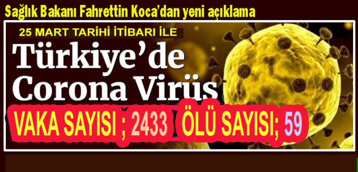 Sağlık Bakanı Fahrettin Koca, Türkiye’deki en son corona virüsü bilançosunu paylaştı. Koca’nın açıkladığı sayılara göre 59 hasta corona nedeniyle hayatını kaybederken vaka sayısı da 2433’e yükseldi.