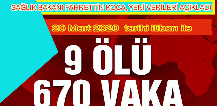 Sağlık Bakanı Fahrettin Koca, 20 Mart 2020 tarihi itibarı ile Türkiye’deki güncel corona virüsü vakalarının sayısını açıkladı. Sağlık Bakanı Fahrettin Koca, “Hasta sayımız 670’e ulaştı. Yaşlı ve direnci zayıf 5 hastamızı kaybettik. Bugüne dek toplam 9 can kaybımız var” dedi. Bakan Koca sosyal medya üzerinden yaptığı açıklamanı devamında ” Tamamı yaşlılarımızdan. Yaşlılarımızı koruyalım. Mücadelemizde bir an bile esneklik göstermeyelim” dedi.
