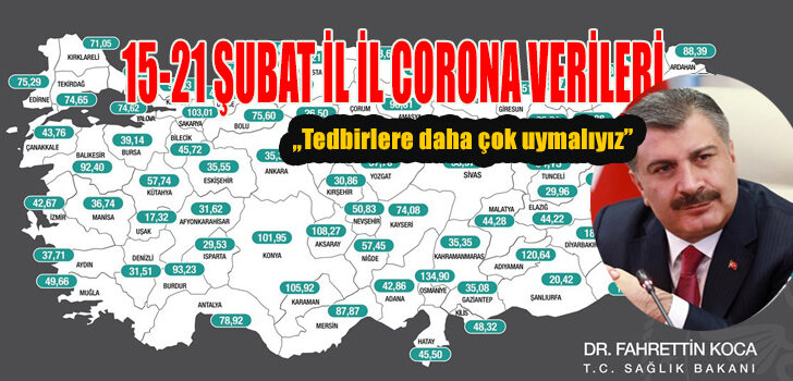 Sağlık Bakanı Dr. Fahrettin Koca, sosyal medya hesabından 15-21 Şubat 2021 haftasına ait il il vaka rakamlarını paylıştı