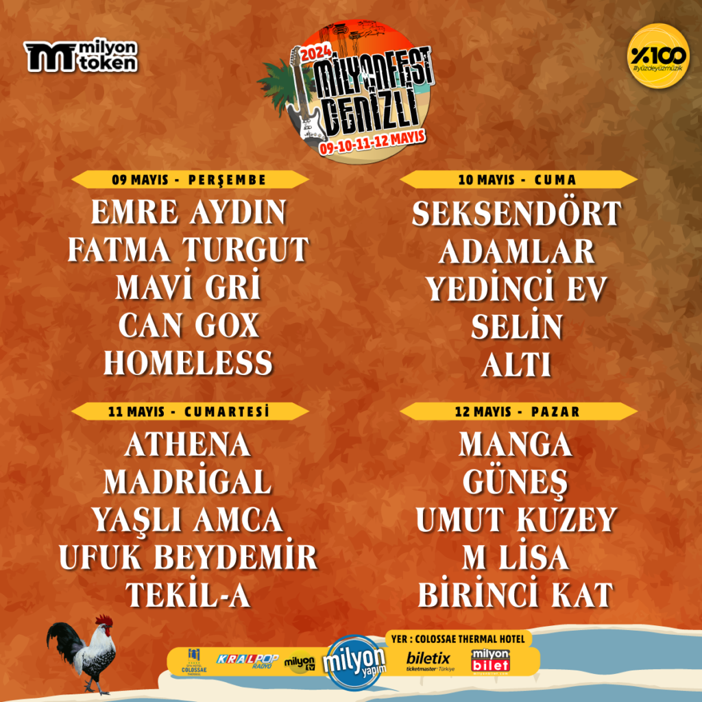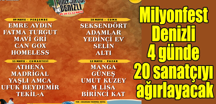 Denizli’nin en büyük müzik festivali Milyonfest Denizli, 9-10-11-12 Mayıs tarihlerinde Türkiye’nin sevilen sanatçılarını müzikseverlerle buluşturacak. Milyon Yapım organizasyonuyla Kral POP Radyo medya sponsorluğunda Pamukkale’deki Colossae Thermal Hotel’in bahçesinde gerçekleşecek Milyonfest Denizli’de 4 gün boyunca Athena, Manga, Emre Aydın, Seksendört, Fatma Turgut, Adamlar, Umut Kuzey, Madrigal, Güneş’in de aralarında olduğu 20 sanatçı sahne alacak. 9-10-11-12 Mayıs tarihlerinde yapılacak Milyonfest Denizli’de müzikseverler unutulmaz bir festival deneyimi yaşayacak. Milyonfest Denizli’nin programı ve sahne alacak sanatçılar şöyle: