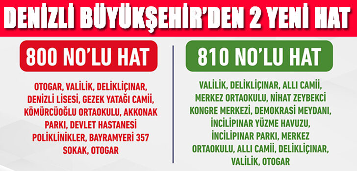 Denizli Büyükşehir Belediyesi Ulaşım A.Ş. kent içi toplu taşımada verimliliği artırmak ve yolcu yoğunluğunu daha iyi yönetmek amacıyla 800 ve 810 numaralı yeni transit hatlarını hizmete sundu. Yeni hatlar, şehir merkezindeki önemli ulaşım noktalarını birbirine bağlayarak hem zaman tasarrufu sağlayacak hem de mevcut hatlarla entegrasyonu güçlendirecek. Yeni devreye alınan 800 ve 810 numaralı hatlar, şehir merkezindeki önemli noktalara kolay erişim sağlayarak ulaşımı daha pratik hale getirecek. 800 ve 810 numaralı hatların sadece belirtilen duraklarda yolcu alıp ve indireceği, ara duraklarda durmayacağı ifade edildi.