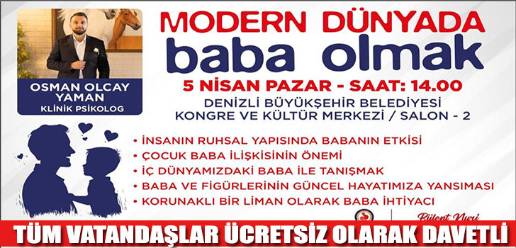 Denizli Büyükşehir Belediyesi, kültürel ve eğitici faaliyetlerine bir yenisini daha ekliyor. Modern yaşamın getirdiği hızlı değişimler içinde babalık makamının önemini ve sorumluluklarını ele alacak olan “Modern Dünyada Baba Olmak” semineri 5 Nisan Pazar günü saat 14.00’te DBB Kongre ve Kültür Merkezi S2 Salonu’nda gerçekleştirilecek. Klinik Psikolog Osman Olcay Yaman’ın konuşmacı olarak yer alacağı seminer; babalık rolünün çocuğun duygusal ve sosyal gelişiminde nasıl bir etki ettiğine odaklanacak. Modern çağın getirdiği zorluklarla başa çıkma yöntemleri, çocuklarla doğru ve sağlıklı iletişim kurmanın yolları, çocuğun karakter gelişiminde babanın etkisi, babaların günlük hayatta karşılaştığı sorunlar ve çözüm önerileri bu seminerde ele alınacak. Seminer, babaların hem bilgi edinmesi hem de kendi deneyimlerini diğer katılımcılarla paylaşması için interaktif bir zemin sunacak.