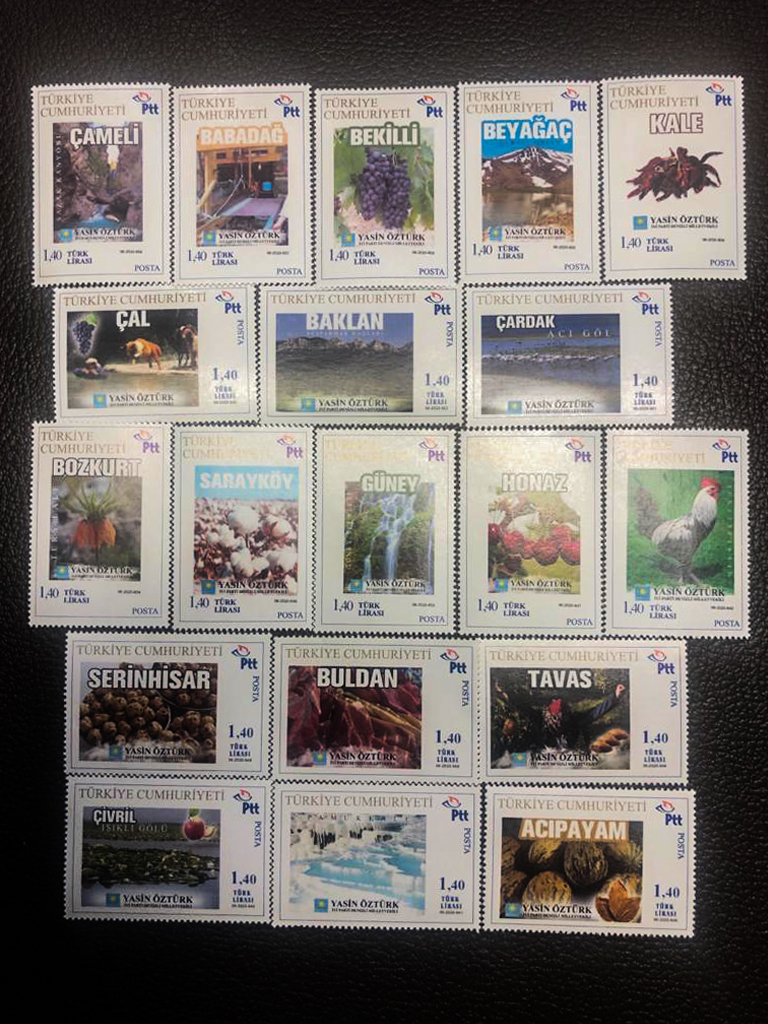 İYİ Parti Denizli Milletvekili Yasin Öztürk’ün, Denizli ilçelerine özel bastırdığı pullarda Denizli merkezi horozuyla, Çameli Sazak Kanyonu’yla, Kale kırmızıbiberiyle, Baklan Beşparmak Dağları’yla, Honaz kirazıyla, Buldan beziyle, Serinhisar leblebisiyle, Çal koyun atlama ve Çal Garası üzümüyle, Babadağ dokumacılığıyla, Çardak Acı Göl ve flamingolarıyla, Tavas zeybek ve baklavasıyla, Bekilli üzümüyle, Pamukkale travertenleriyle, Acıpayam kavunuyla, Güney şelalesiyle, Bozkurt Ters Lalesiyle, Beyağaç Kartal Gölüyle, Çivril Işıklı Gölüyle, Sarayköy pamuğuyla tanıtıldı.