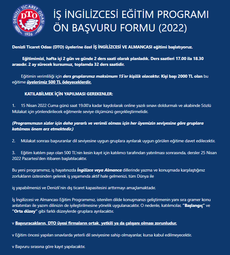 Eğitimlere katılmak isteyenler, aşağıdaki linke tıklayarak ulaşacakları İş İngilizcesi Eğitim Programı Ön Başvuru Formu’nu doldurarak başvurularını gerçekleştirebiliyorlar.