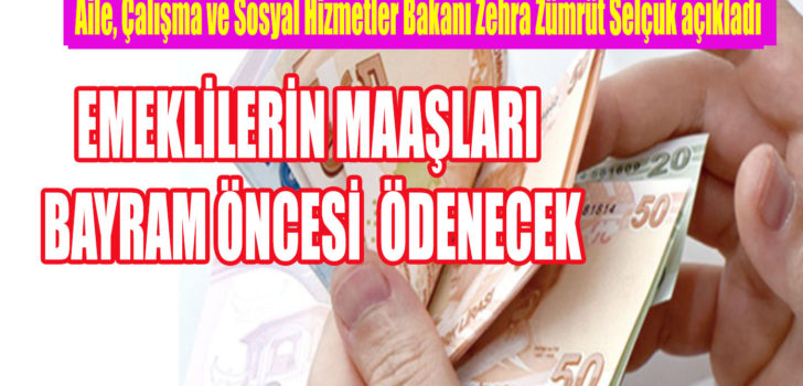 Aile, Çalışma ve Sosyal Hizmetler Bakanı Zehra Zümrüt Selçuk, emekli aylığı ödemelerinin 15-22 Mayıs tarihleri arasında yapılacağını açıkladı. Rutin ödeme günü; 17, 18, 19, 20 olanlara 15 Mayıs’ta, 21, 22, 23 olanlara 18 Mayıs’ta, 24, 25, 26 olanlara ise 20 Mayıs’ta emekli aylıkları ödenecek. 4B (Bağ-kur) kapsamındaki emeklilerimiz ve hak sahiplerine ise ödeme günü; 25-26 olanların 21 Mayıs’ta, 27, 28 olanların da 22 Mayıs’ta aylıkları hesaplara yatırılacak.