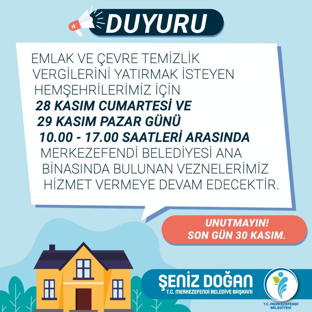 Merkezefendi Belediyesi, Emlak ve Çevre Temizlik Vergisi’nin ikinci taksit ödemelerinin son günü 30 Kasım 2020 Pazartesi günü olması ve pandemi nedeni ile yoğunluk yaşanmaması için hafta sonu veznelerini açık tutacak. Vatandaşlar 28 Kasım Cumartesi ve 29 Kasım Pazar günü saat 10.00 ile 17.00 saatleri arasında Merkezefendi Belediyesi Ana binasında bulunan veznelerde vergilerini yatırabilecekler. Merkezefendili vatandaşlar veznelerde vergisini kredi kartı ile de ödeme yapabilecek. İsteyen vatandaşlar ödemelerini Merkezefendi Belediyesi resmi internet sayfası http://www.merkezefendi.bel.tr/ üzerinden; Halkbank ATM’lerinden ve www.halkbank.com.tr intenet şubesinden de yapılabilecekler.