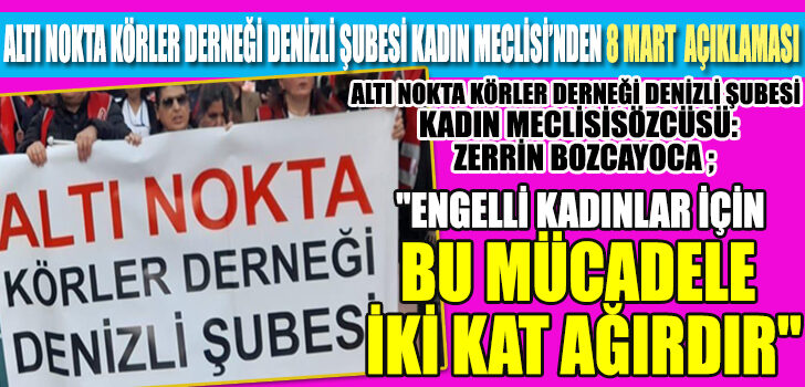 Altı Nokta Körler Derneği Denizli Şubesi Kadın Meclisi Sözcüsü Zerrin Bozcayoca 8 Mart Dünya Emekçi Kadınlar Günü dolayısı ile bir mesaj yayımlayarak Engelli kadınlar için bu mücadele iki kat ağırdır diyerek yaşanan olumsuzlukları dile getirdi.
