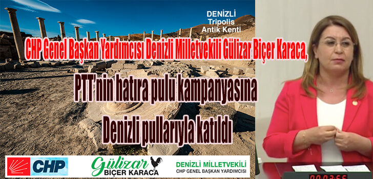 CHP Genel Başkan Yardımcısı Denizli Milletvekili Gülizar Biçer Karaca, PTT’nin hatıra pulu kampanyasına Denizli pullarıyla katıldı. Bastırdığı PTT pullarında, Denizlili fotoğraf sanatçısı Zeki Akakça’nın çektiği ve kendilerinee paylaşım izni verdiği Denizli fotoğrafları yer aldığını söyleyen Denizli Milletvekili Gülizar Biçer Karaca, “Amacımız Denizlimizin tanıtımına katkı sağlayabilmek. Özel olması için de bugüne kadar çok sayıda fotoğrafıyla Denizli’nin farklı özelliklerini, zenginliğini yansıtan karelere imza atan Zeki Akakça’nın çektiği fotoğrafların yer almasının ve Türkiye’nin dört bir yanına gönderilerde Pamukkale, Tripolis, Hierapolis Antik kenti fotoğrafları yer alacak. Fotoğraf sanatçısı Zeki Akakça’ya bu özel fotoğrafları paylaşması, ilimizin tanıtımına destek için katkı sağlaması nedeniyle teşekkür ediyorum.” dedi.
