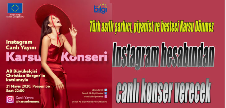 Hollanda’da yaşayan Türk asıllı şarkıcı, piyanist ve besteci Karsu Dönmez, Perşembe akşamı saat 22:00’de (bu akşam) Denizli Sanayi Odası AB Bilgi Merkezi ve AB Türkiye Delegasyonu işbirliği ile Instagram hesabından canlı konser verecek.