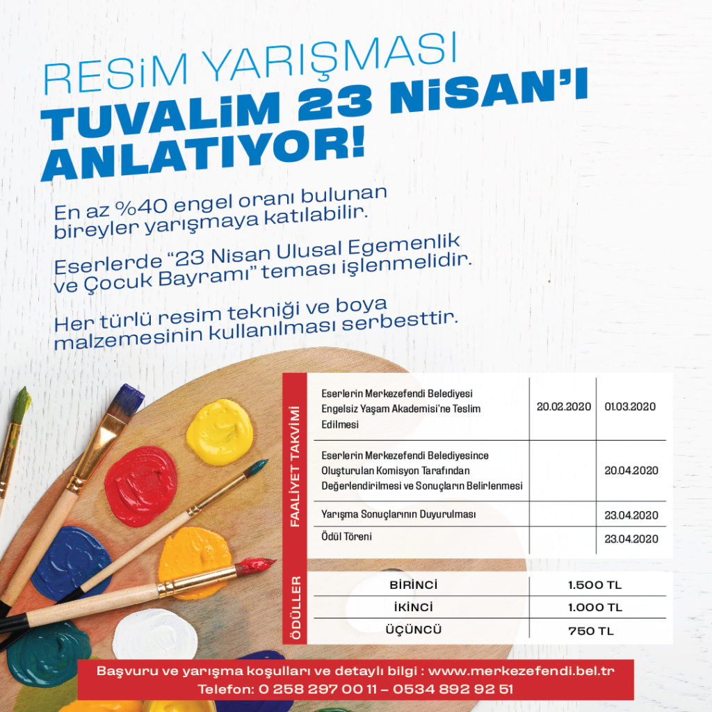 Merkezefendi Belediyesi, kültürel ve sosyal faaliyetler kapsamında resim yarışması düzenliyor. Bu kapsamda %40 ve üzeri engelli olmak şartıyla, yaş ve engel grubu ayrımı olmaksızın tüm engelli bireylerin katılabileceği ‘Tuvalim 23 Nisan’ı Anlatıyor’ isimli resim yarışması düzenlenecek. Eserlerde ‘23 Nisan Ulusal Egemenlik ve Çocuk Bayramı’ teması işlenecek. Yarışmaya katılan vatandaşlar, her türlü resim tekniğini ve boya malzemesini kullanabilecek. Eserler, 20 Şubat ile 1 Mart tarihleri arasında Merkezefendi Belediyesi Engelsiz Yaşam Akademisi’ne teslim edilecek. Teslim edilen resimler, 20 Nisan’da Merkezefendi Belediyesince oluşturulan komisyon tarafından değerlendirilecek ve sonuç belirlenecek. Yarışma sonuçları ve ödül töreni ise 23 Nisan’da gerçekleştirilecek. Resim yarışmasında birinci olana bin 500 TL, ikinci olana bin TL ve üçüncü olana 750 TL ödül verilecek. Yarışmaya katılacak olan vatandaşlar, başvuru ve yarışma koşulları için http://www.merkezefendi.bel.tr/ adresinden veya 0258 297 00 11 – 0534 892 92 51 numaralarından detaylı bilgi alabilecek.
