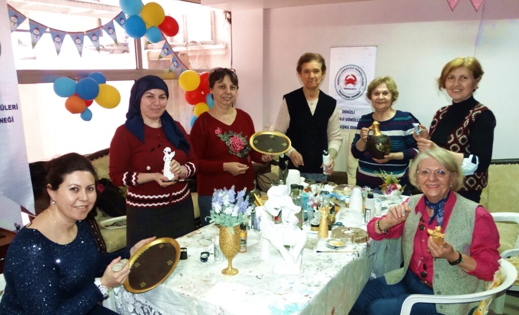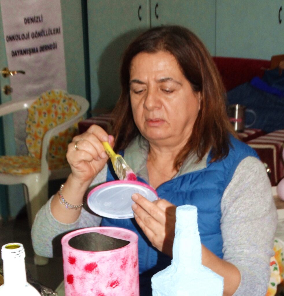 Denizli Onkoloji Gönüllüleri Derneği; haftada bir gün onkoloji hastaları ve hasta yakınları için el sanatları kursu düzenliyor. Evlerde kullanılmayan şişe, bardak, tepsi gibi eskimiş objeleri boyayarak güzelleştiren kursiyerler, stres attıkları kursta zamanın nasıl geçtiğini anlamıyorlar.