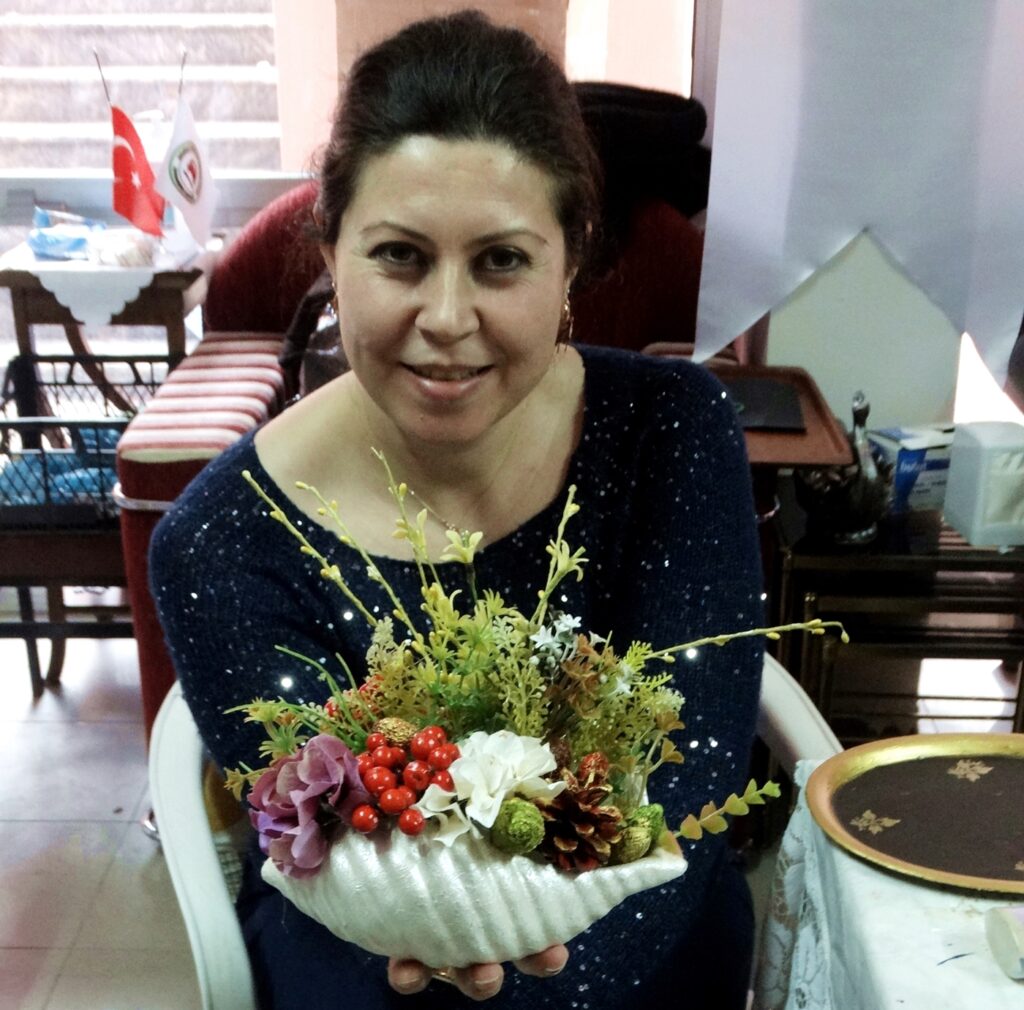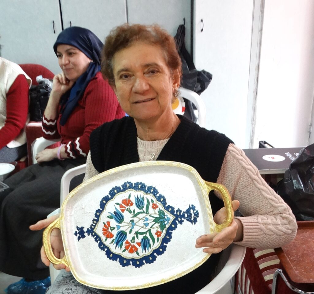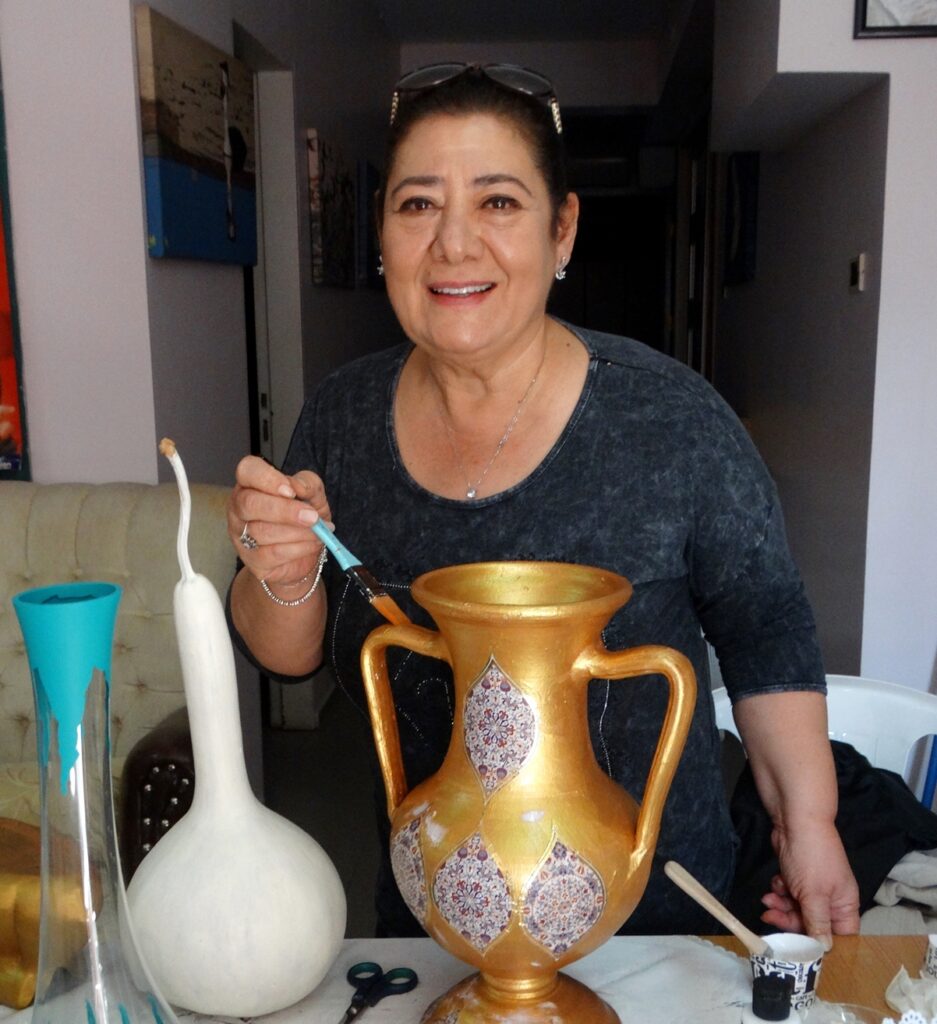 Ben kursa yeni başladım. Boyama işi gerçekten çok zevkliymiş, çok sevdim. Ben çocuklarım için şişeden objeler yaptım, tepsi boyadım. Burada nasıl zaman geçiyor anlamıyorum.