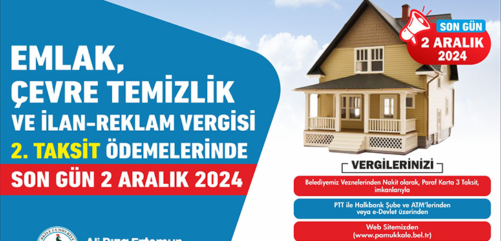T.C. Pamukkale Belediyesi, Emlak, Çevre-Temizlik ve İlan-Reklam Vergisi ikinci taksit ödemelerinin başladığını duyurdu. Ödemelerde son tarih 2 Aralık 2024.