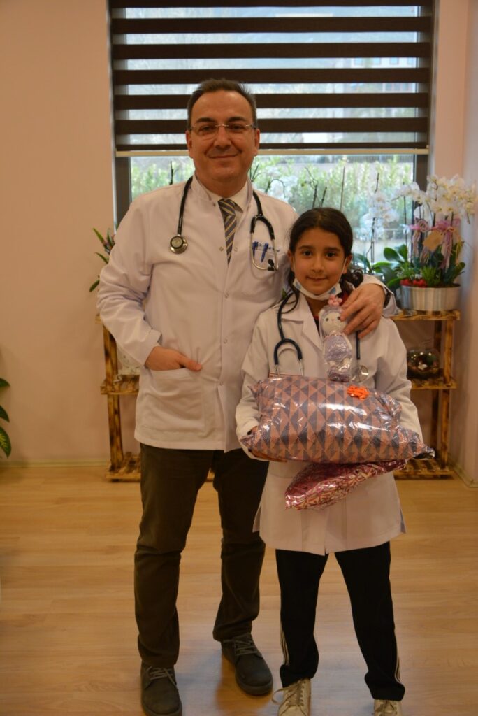 İsminin yazılı olduğu önlüğü giyen kızımız mutluluğunu başhekim Prof. Dr. Selçuk Yüksel’e sarılarak gösterdi. Mumları üflerken doktor olmayı dilediğini söyleyen Cennet Ela ileride çok iyi bir doktor olacağını söyledi ve hayatı boyunca unutamayacağı bir doğum günü yaşattığı için Başhekime teşekkür etti.