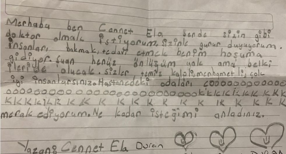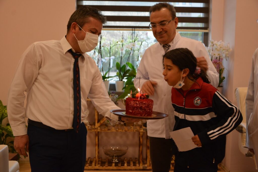 Yazdığı mektubu hastanenin en büyük doktoruna verilmesini isteyen küçük kızımız başhekimlik makamına çağırılınca çok mutlu oldu. Mektubu alan Başhekim Prof. Dr. Selçuk Yüksel, Cennet Ela ‘ya sürpriz doğum günü düzenleterek hem mum üfletti hem de önlük giydirerek hediyesini verdi. Hiçbir şeyden haberi olmayan Cennet Ela’nın şaşkınlıktan gözleri doldu.