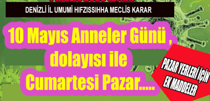 a) 22 nolu İl Umumi Hıfzıssıhha Meclis Kararları 2. Maddesinde belirtilen açık olacak işyeri, işletme ve kurumlara ek olarak 10 Mayıs Anneler Günü münasebetiyle çiçekçilerin Cumartesi ve Pazar günü evlere/adrese servis şeklinde satış yapabilmelerine,