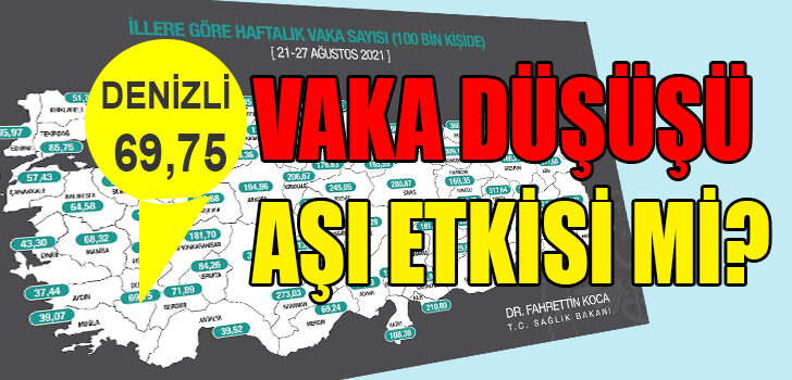 Sağlık Bakanı Sosyla medya hesabından yaptığı paylaşımla illerde 100bin nüfusa karşılık gelen vaka haritasına göre ilimiz Denizli 69,75 vaka tespit edilmiş göründü. Geçtiğimiz haftalara göre vaka sayılarında görülen düşüşün aşılanma oranına bağlandığı ileri sürüldü.