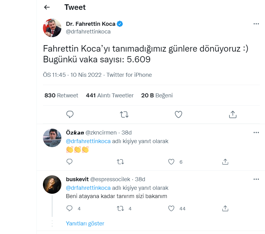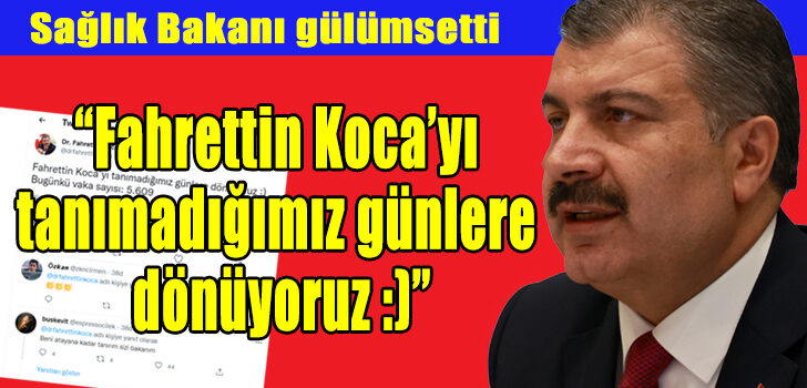“Fahrettin Koca’yı tanımadığımız günlere dönüyoruz” “Bugünkü vaka saysıı 5609 ” düşük çıkan koronavirüs vaka sayısını belirterek paylaştı.