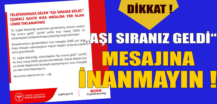 Yapılan açıklamada dolandırıcıların ,SMS göndererek ” Aşı sıranız geldi” diyerek sahte bir link verip, kişileri kötü amaçlarına alet etmek istedikleri belirtildi. Sağlık Bakanlığı tarafından yapılan açıklamada vatandaşlara kısa içerikli mesaj GÖNDERMEDİKLERİ belirtildi.