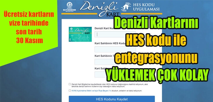 İçişleri Bakanlığının “Şehir İçi Toplu Ulaşımda HES Kodu Kullanımı”na yönelik genelgesinin ardından çalışmalara başlayan Denizli Büyükşehir Belediyesi, “Denizli Kart”ların HES kodu ile entegre edilmesi için büyük kolaylık getirdi. Henüz kişiselleştirilmemiş Denizli Kartlar kart dolum merkezlerinde vatandaşlar adına kayıt edilirken, bunun daha hızlı ve kolay yapılması için Denizli Büyükşehir Belediyesi Bilgi İşlem Dairesi Başkanlığı online entegre sistemi getirdi. Vatandaşlar cep telefonu, tablet ya da bilgisayarları ile hes.denizli.bel.tr adresine girerek Sağlık Bakanlığının Hayat Eve Sığar uygulamasından aldığı HES kodunu kullandıkları Denizli Kart ile entegre edebiliyor. Bunu için Denizli Kart numarası, HES kodu, TC kimlik no ve Ad-Soyad yeterli oluyor.