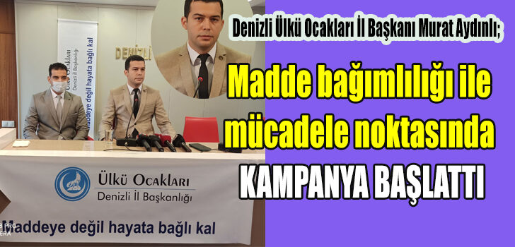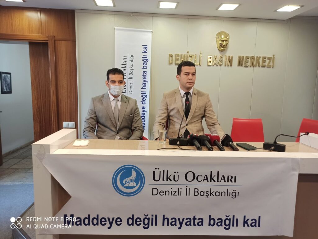 Uyuşturucu kullanımının önüne geçmek adına başlattıkları kampanya ile ilgili basın toplantısı düzenleyen Denizli Ülkü Ocakları İl Başkanı Murat Aydınlı,” ‘Denizli yeni bir sayfa açıyor’ sloganıyla basın mensupları aracılığıyla madde bağımlılığı ile mücadele noktasında hemşehrilerimize bir çağrıda bulunmaktayız” dedi. Başkan Murat Aydınlı’nın açıklaması şu şekilde;