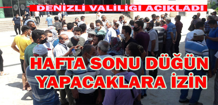 Dün 19 Ağustos 2020 tarihinde Denizli Valiliği tarafından il UMUMİ HIFZISSIHHA KANUNU oy birliği ile almış olduğu karar ile sokak düğünlerinin yasaklandığı duyurulmuştu. Sokak düğünleirnin yasaklanmasının ardından mağdur olduklarını dile getiren düğün sahibi vatandaşların Denizli Valilik binası önüne gelerek yaptığı girişim sonucu Valilik tarafından pazartesiye kadar olmak üzere sokak düğünlerinin 2 saat yapılmasına izin verildi. Yapılan görüşmede sadece bu hafta sonu geçerli olmak üzere sokak düğünlerine, yiyecek ikramı olmadan 2 saatliğine izin verildi. Verilen izin sonrası vatandaşlar valilik yetkililerine teşekkür ederek ayrıldışar.